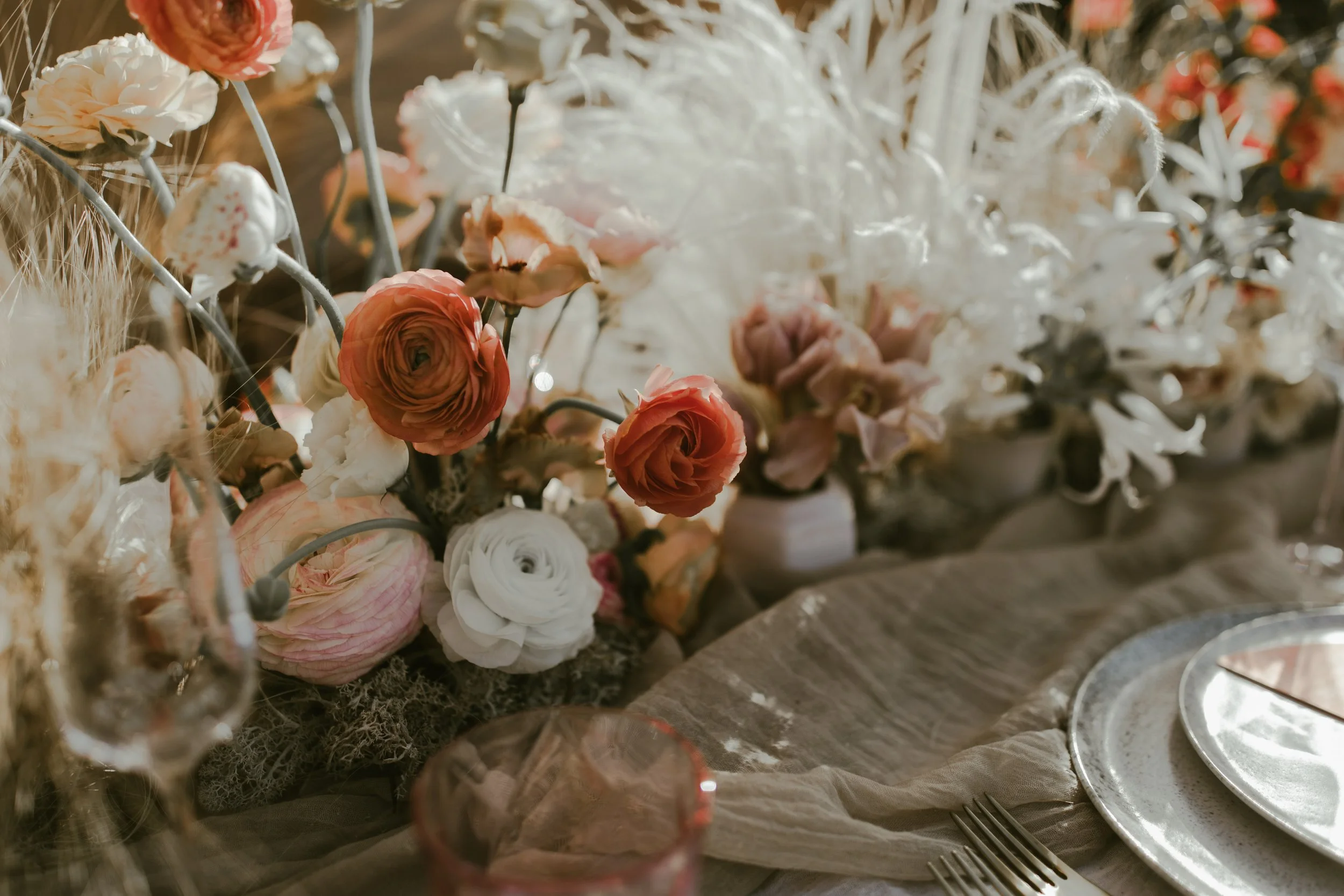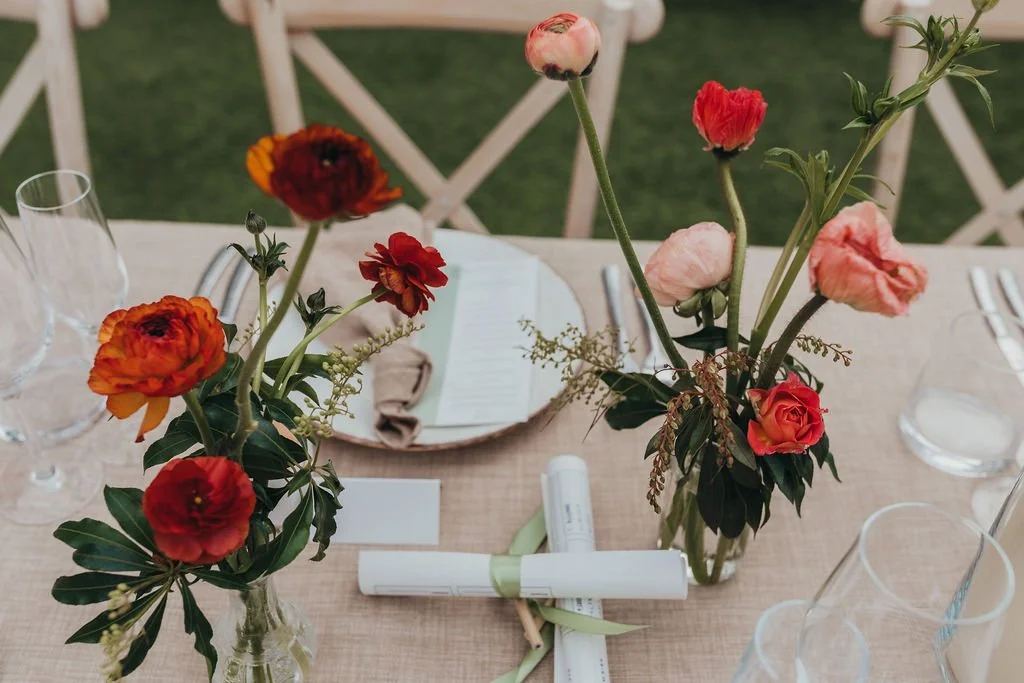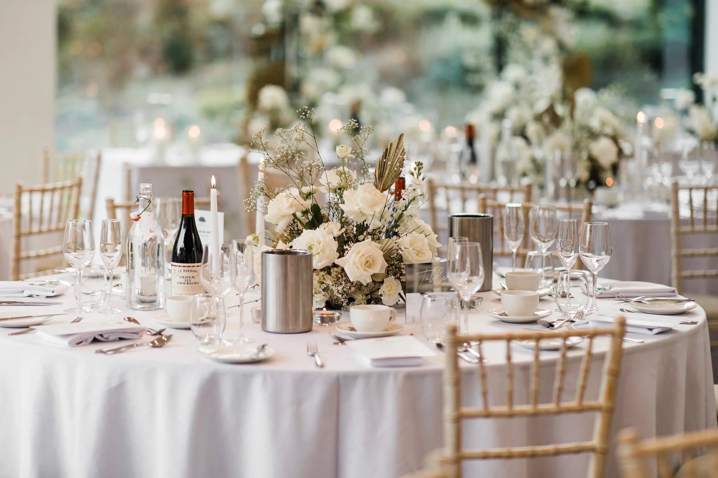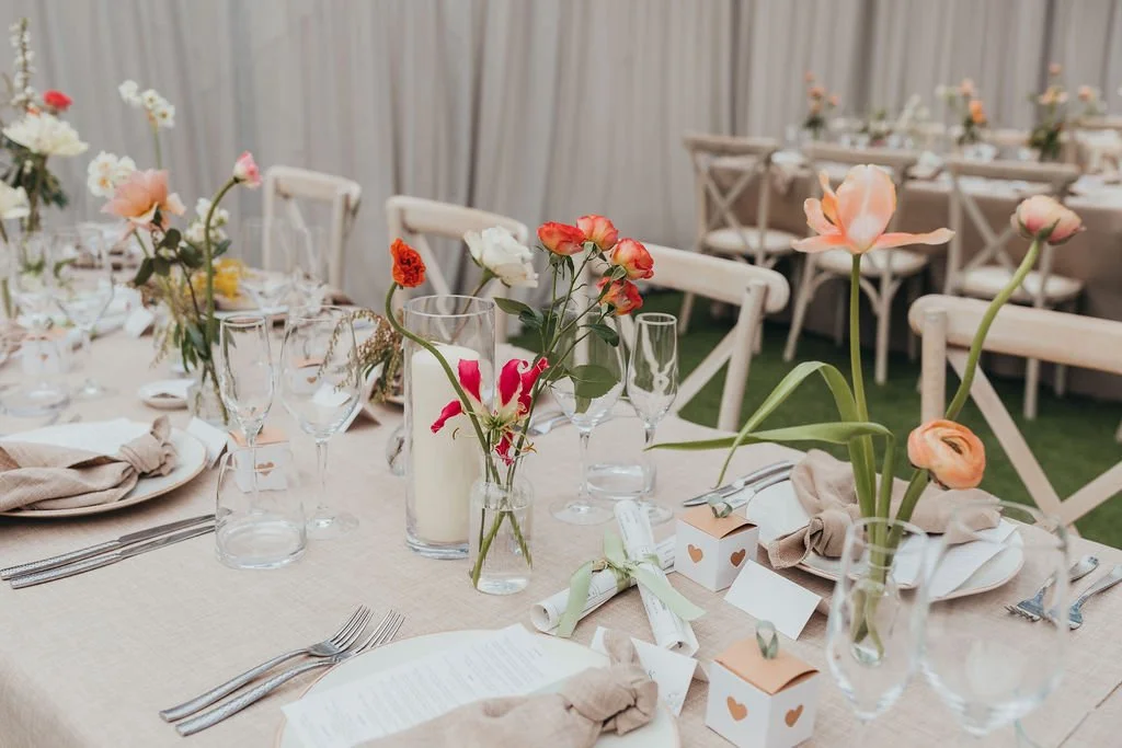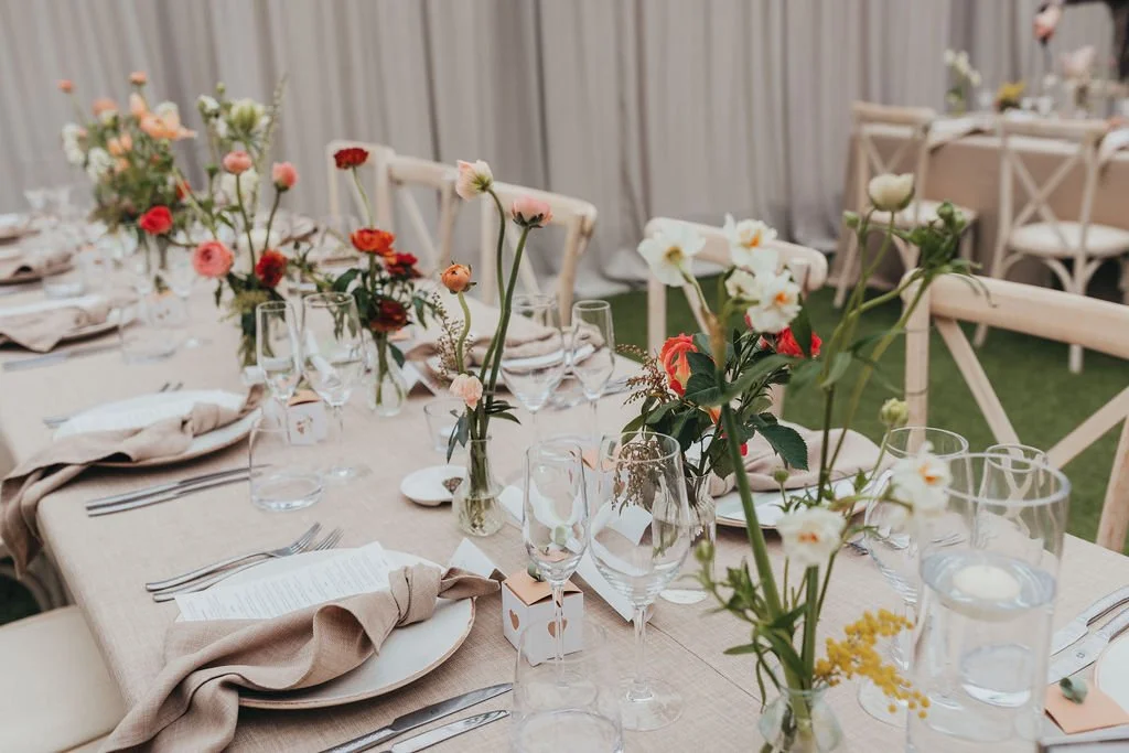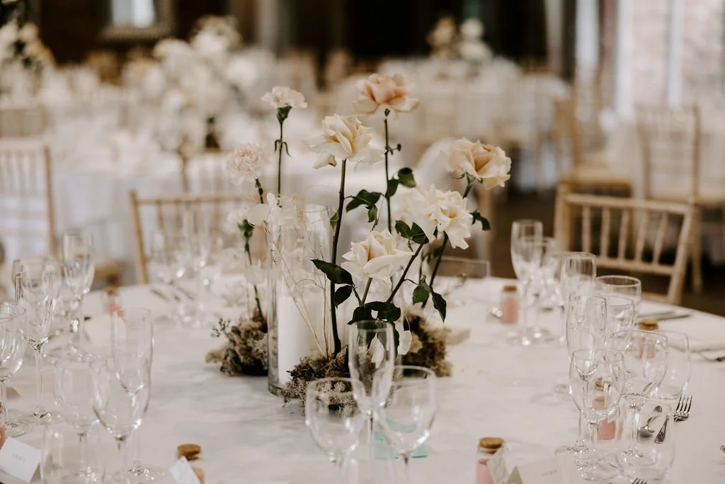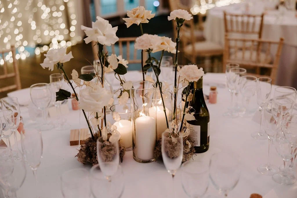 When it comes to centrepieces there’s a lot to think about… Are you having long trestle tables or round? How long are your trestle tables so we can calculate how much floral we can fit in the budget? Which vase, vessel or accessory colour suits your wedding theme? White, Terracotta, Gold, Grey, Glass or Black? Alternatively opt for floral made in an undetectable, disposable dish so you can take the flowers home with you in tact.